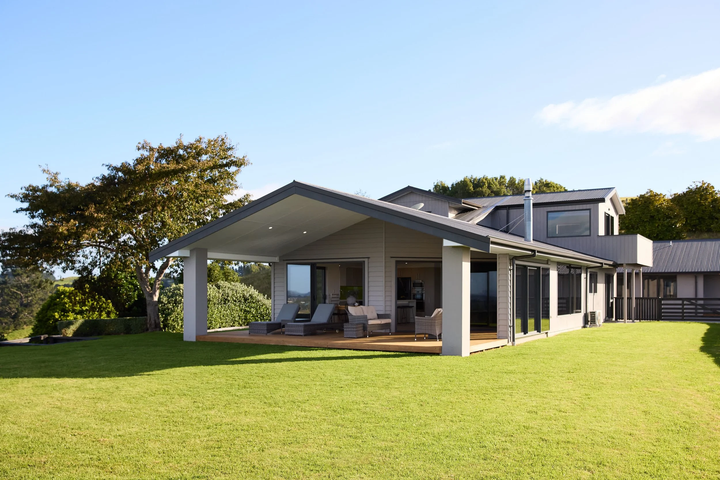 Roof extension to create cover over deck/loggia, the addition of a master bedroom with ensuite and walk in rob, and garage; adding approx.196m2. Engineered timber pole retaining wall with concrete set H5 timber pilings.