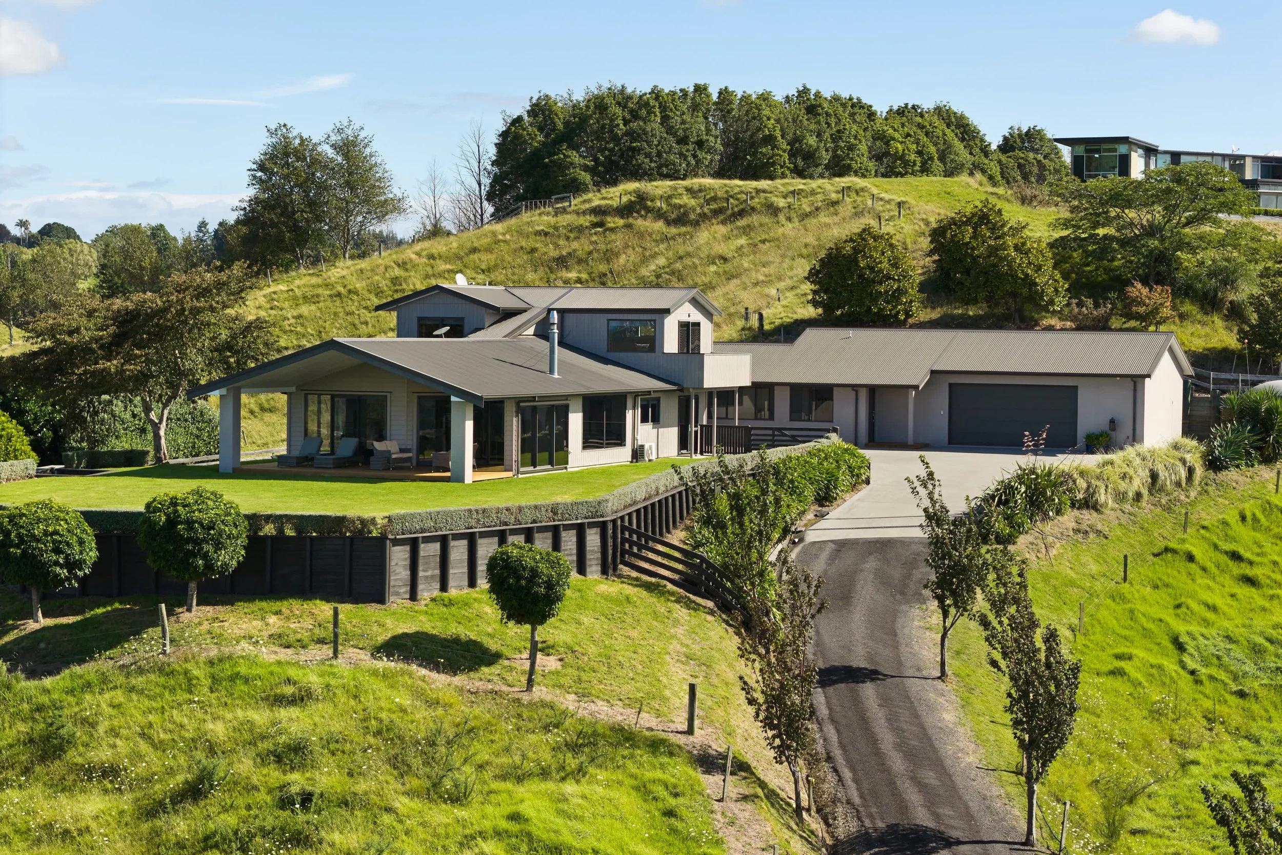 Through stone entry pillars at the end of Walden Lane, the sealed drive climbs gently to the three homes in this private enclave. Automated gates and a delivery shed mark the entrance to 49C’s exclusive driveway. As the seal continues, it overlooks a grazing gully with areas of bush and passes a large staging area with a stockyard and established infrastructure with additional covered storage, and a large Kiwispan shed. The final easy rise to the house site skirts an expanse of flat land with endless improvement and recreational options.