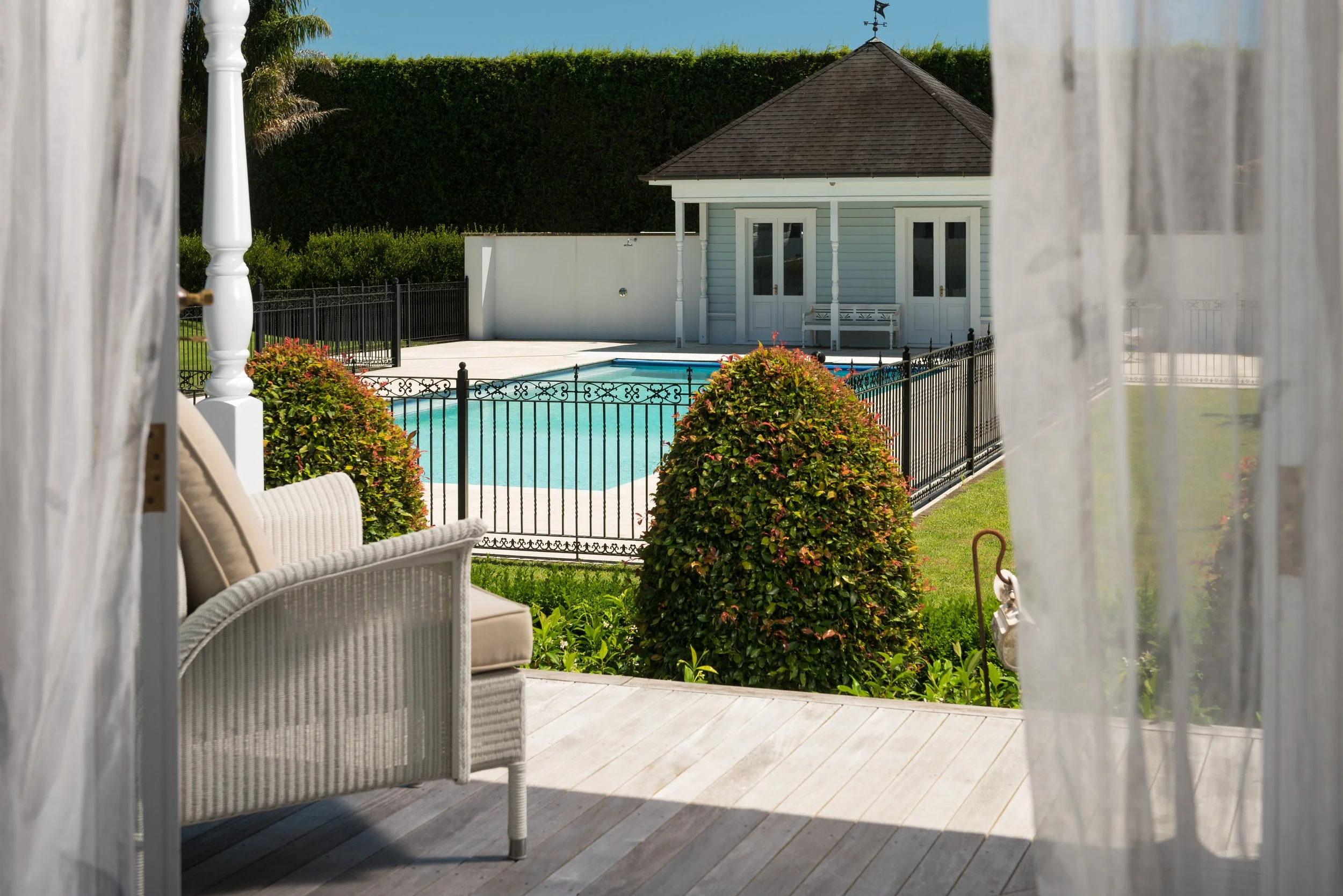 Outdoor living has been prioritised and is well positioned. One of the largest residential pools in the region is supported by a considerable pool house with an outdoor shower, pool equipment room, his and hers changing rooms, powder room, storage area and a laundry. A decorative wisteria covered arbour with a solid Macrocarpa outdoor setting sits alongside the pool area.