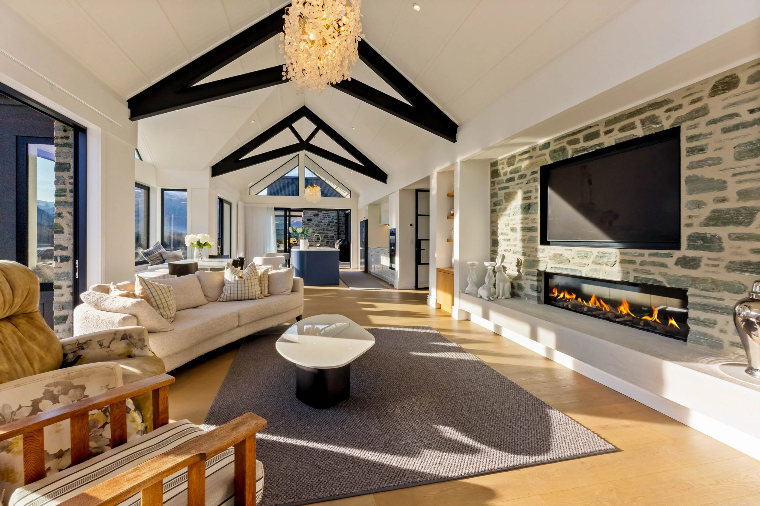 The floorplan calibrates volume and intimacy, unfolding over approximately 380 m² of beautifully detailed accommodation. The interiors are defined by a tactile warmth; internal stone feature walls juxtapose against extensive glazing, drawing the dramatic lake foreground and mountain skyline into the daily rhythm of the home. A central hydraulic lift ensures the residence remains a forever home, providing easy vertical connection between the garaging and ground floor guest suites, the primary living level, and the penthouse-style third floor.